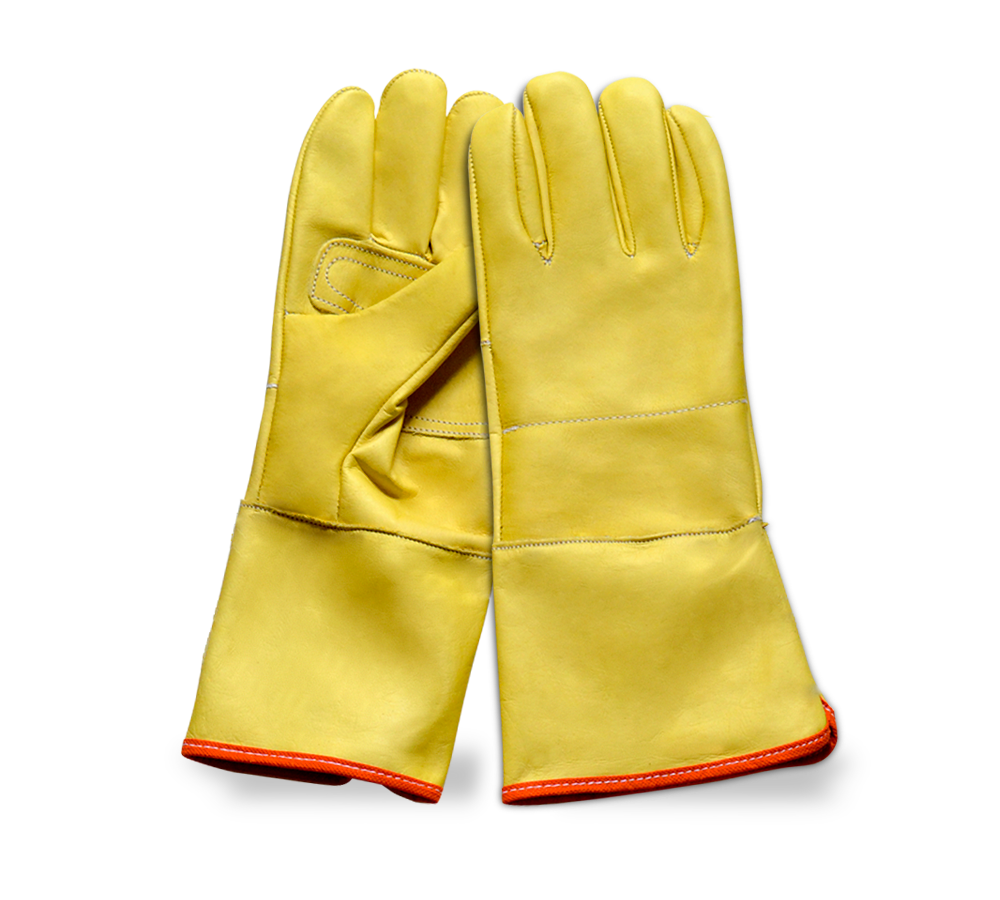 Descripción: Fabricado en material de cuero (Carnaza) de res. Sistema de cosido con hilo poliéster blanco, refuerzo externo en vaqueta en la palma y cinco dedos para mayor protección, resistencia y duración.